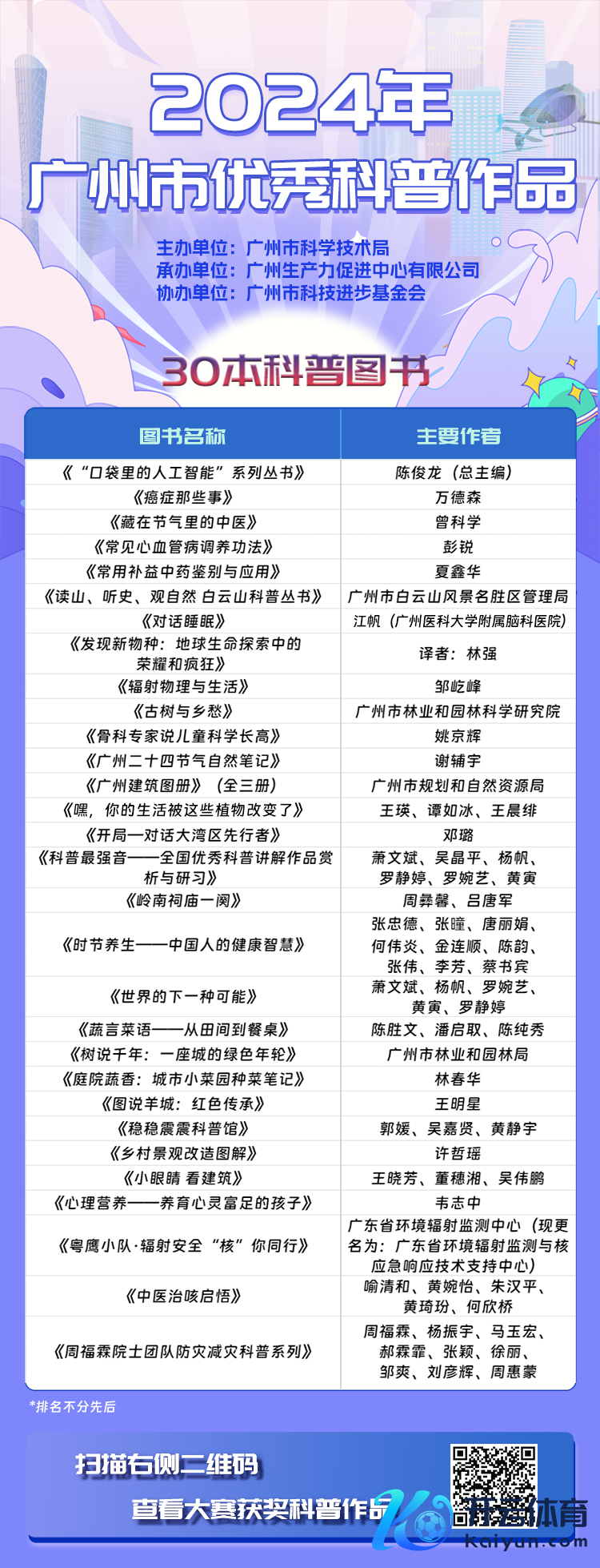 为不停丰富东谈主民各人的科学文化生涯,进一设施动全社会投身科学传播的积极性,放肆露出科学精神、普及科学学问、传播科学念念想、主张科学样式,广州市举办了2024年广州市科普作品大赛。大赛赢得精深科技责任者与科普创作家的存眷参与,共搜集到参赛作品662部,经履历审查、公众网罗投票、各人评比、公示等样式,评比出《“口袋里的东谈主工智能”系列丛书》等30本(套)优秀科普典籍、《“玫瑰”养护指南——造口东谈主的平素生涯》等30部优秀科普微视频、“39健康网”等10个优秀科普号,并决出最具网罗东谈主气奖科普典籍、科普微视频和科普号各3部(个),选题支撑科普作品35部(科普典籍5部,科普微视频30部)。
