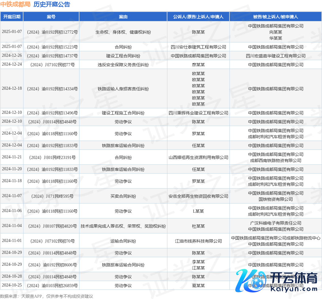 本站音讯开yun体育网,字据天眼查APP表露,近日公布了一则中国铁路成皆局集团有限公司行为被告/被上诉东说念主的开庭公告,详备本体如下: