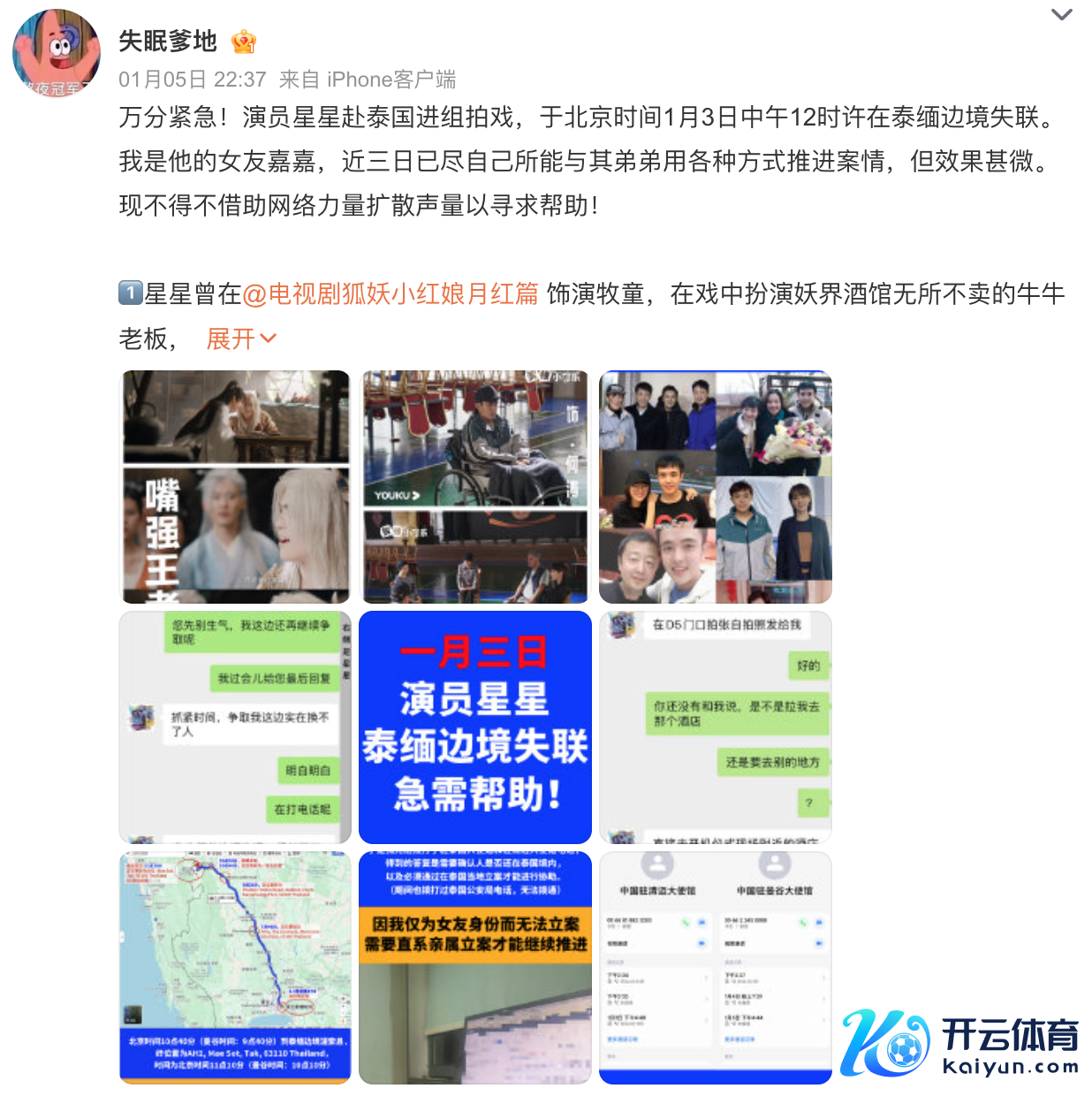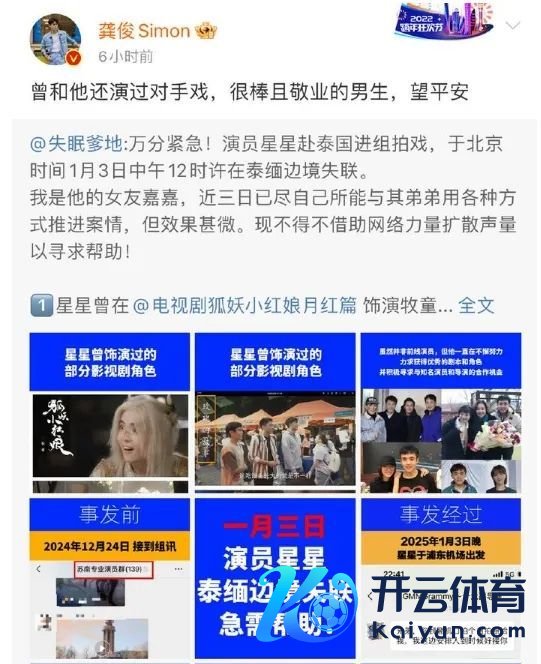 1月5日,演员王星女友嘉嘉诳骗酬酢账户“失眠爹地”在酬酢平台上发文乞助开云体育,称男友星星赴泰国进组拍戏,于北京时候1月3日中午12时许在泰缅边境失联。