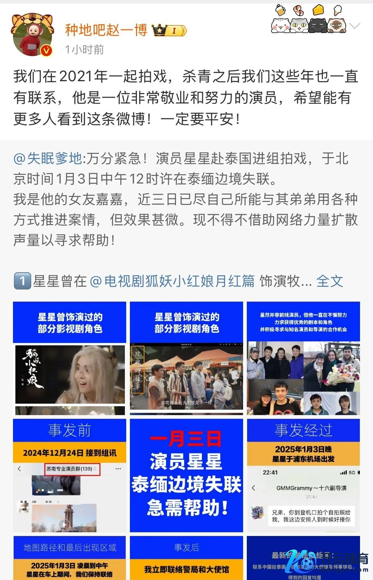 嘉嘉发文称:“万分蹙迫!演员星星赴泰国进组拍戏,于北京时候1月3日中午12时许在泰缅边境失联。我是他的女友嘉嘉,近三日已尽我方所能与其弟弟用多样步地鼓励案情,但成果甚微。现不得不借助集聚力量扩散声量以寻求匡助!通过这些天的努力,我发现这么的碰到关于等闲东谈主来说壁垒重重,我自知一个东谈主的力量轻捷,但也毫不肯毁灭任何契机!技术也遍及次反省我方,莫得把捏契机、作风不够签订…骗取东谈主员也收拢了星星的情态,使其毁灭了好多可能逃走的契机。但事已至此,我一定辛苦而为,逆转神情。信服Love can fight everything。事件紧要,费心到方方面面,我还保留了好多细节和物证莫得发出,待有确凿能提供匡助的东谈主后与之更进。最临了,恳请大众帮帮我,救星星于水火,散伙推行版的《作死马医》。”