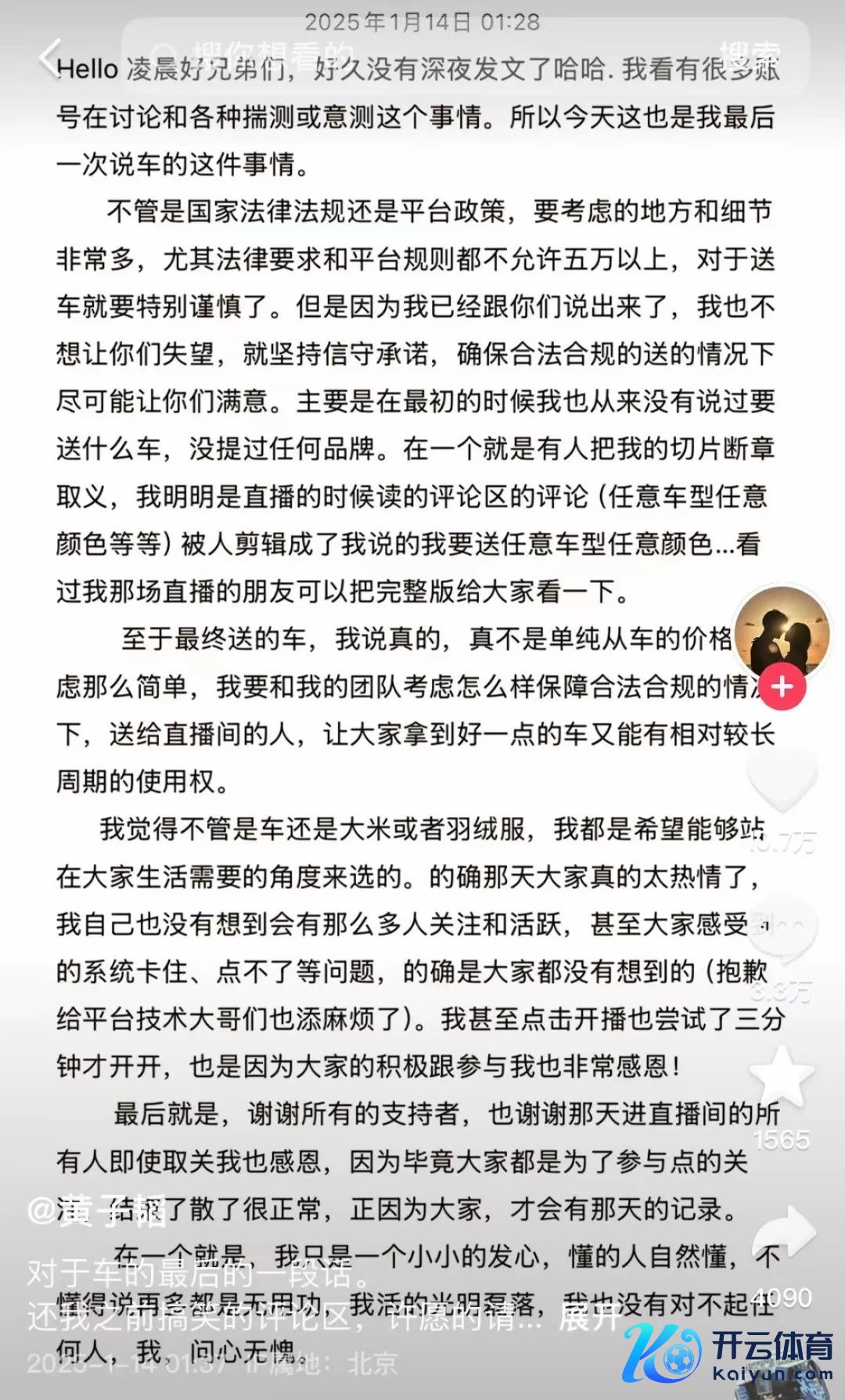 “终末即是,谢谢所有这个词的扶植者,也谢谢那天进直播间的所有这个词东谈主。即使取关我也感德,因为毕竟环球皆是为了参与点的关注,限定了散了很泛泛,正因为环球,才会有那天的记载。”
