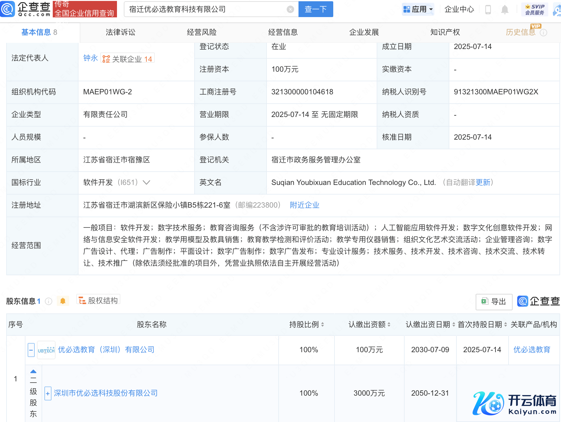 企查查APP泄露,近日,宿迁优必选教化科技有限公司建筑,法定代表东谈主为钟永,辩论鸿沟包含:东谈主工智能期骗软件劝诱;数字文化创意软件劝诱;汇注与信息安全软件劝诱等。企查查股权穿表泄露,该公司由优必选(09880.HK)辗转全资抓股。