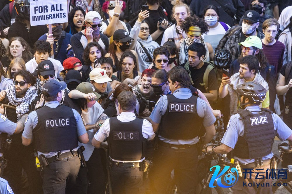 6月10日,在好意思国芝加哥市中心,抗议者与窥察宝石。新华社发(文森特·约翰逊摄)